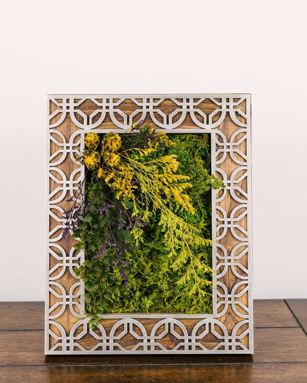 Small, framed moss art featuring an array of preserved mosses and other accents. This small size is perfect for a bathroom, hallway, or gallery wall.